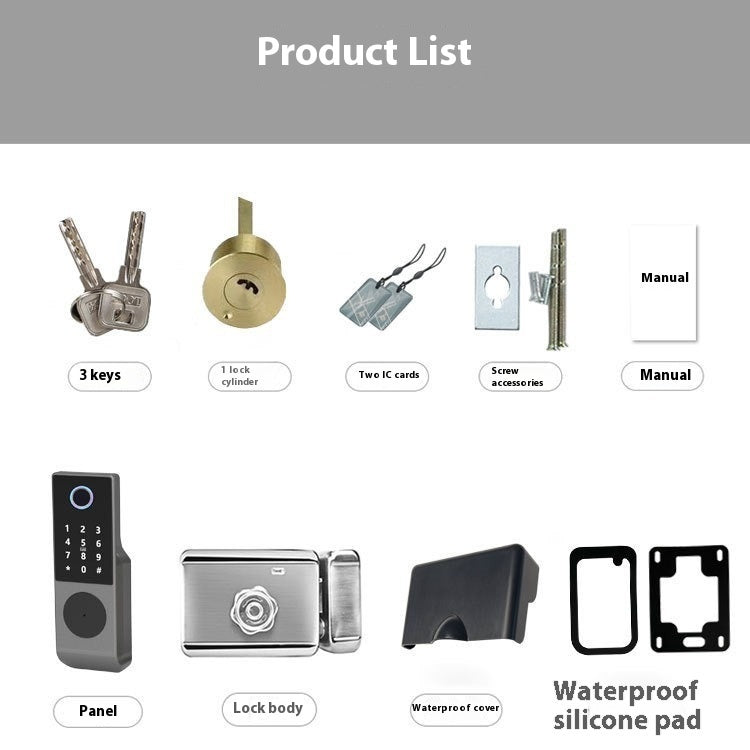 Door panel * 1, lock core * 1, IC card * 2, screw accessories * 1, manual * 1, panel * 1, lock body * 1, waterproof cover * 1, waterproof silicone pad * 1